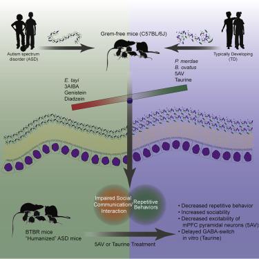 - 在此,我们搬出一篇关于自闭症的《CELL》文章,自闭症谱系障碍(ASD)是一系列复杂的神经发展障碍性疾病,影响人们的社交,行为和交流方面的能力。有孤独症谱系障碍的人,主要体现在社会交流障碍、语言交流障碍和重复刻板行为,主要表现为人类复杂行为的改变。除了遗传的原因外,研究人员观察到,与正常人群相比,ASD患者的肠道微生物有着较大的差异。科学家们将二者的肠道菌群移植到无菌小鼠中,发现定植ASD患者肠道菌群的小鼠大脑中发现了自闭症相关基因的可变剪切,说明肠道菌群在某种调节机制下导致了这个变化。此外,调节肠道菌群,可以明显的改善大脑神经元的异常兴奋。这个实验简而言之就是:自闭症患者的肠道菌群可以引发小鼠发生类似自闭症情况,而调节微生物菌群对改善自闭症有积极作用。 Human Gut Microbiota from Autism Spectrum Disorder Promote Behavioral Symptoms in Mice.