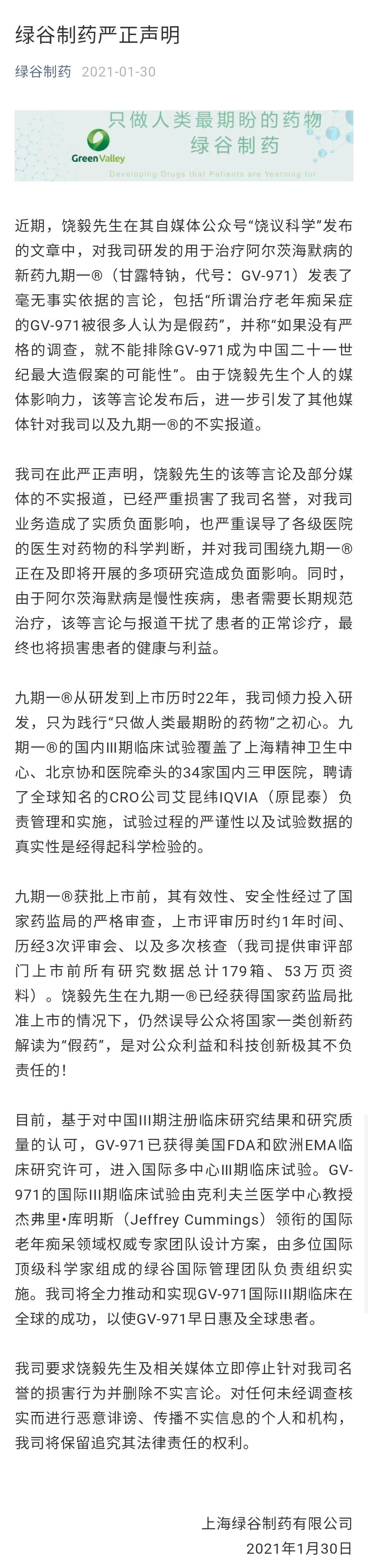 绿谷要求饶毅立即停止侵害名誉权,删除不实言论。肠道微生物对于人体的重要性由于酸奶厂商的大力宣传而人尽皆知,目前市场上也有很多活菌型饮品。补充益生菌也成为人们保健的一种新方式。而绿谷生物阿尔兹海默新药的研发,我们在此只能表示,个例研究中是否存在数据造假的情况,我们不得而知。神仙打架,我们只能吃瓜。