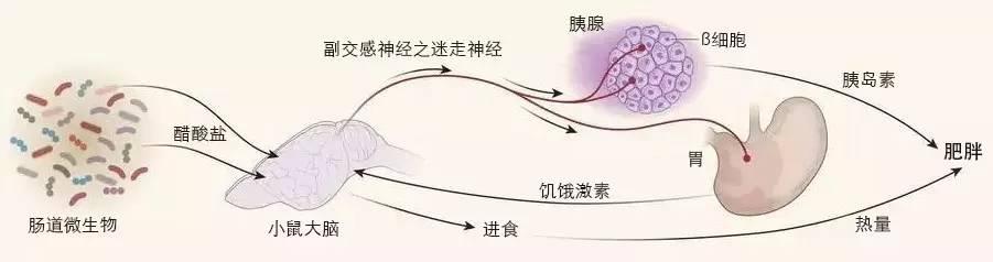 - 你以为你想吃?不,是它们想吃 当你的肠道菌群适应了高热量的食物之后,在高热量的食物在经过消化道进入到肠道之后,肠道微生物就开始完成剩下的消化工作。肠道微生物的消化过程中,会产生大量的醋酸盐类物质。通过肠道壁吸收,传给大脑,大脑收到信号之后激活副交感神经去指挥我们的胰岛素分泌,同时副交感神经也偷偷通知了胃,胃就给大脑说它饿了,于是饥饿感随之而来,大脑指挥你的双手给嘴里继续塞东西。这么个流程,你看,你感觉饿了,是你真的饿了么?